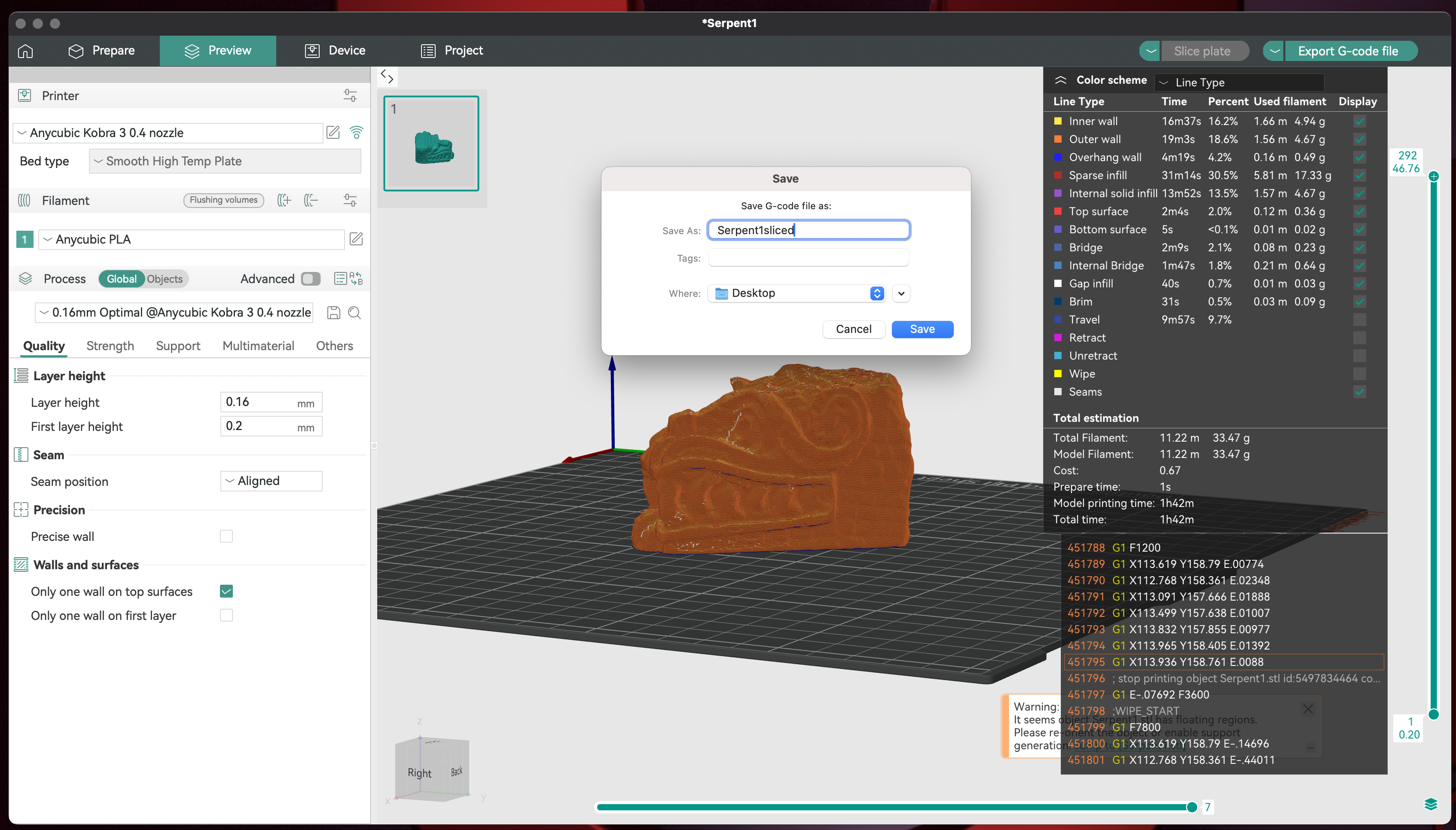You can preview each layer, and nozzle position within each layer, by moving the toggle bars at the right and bottom of the screen. Save the sliced file as a .gcode file to an SD card or USB drive for printing.
