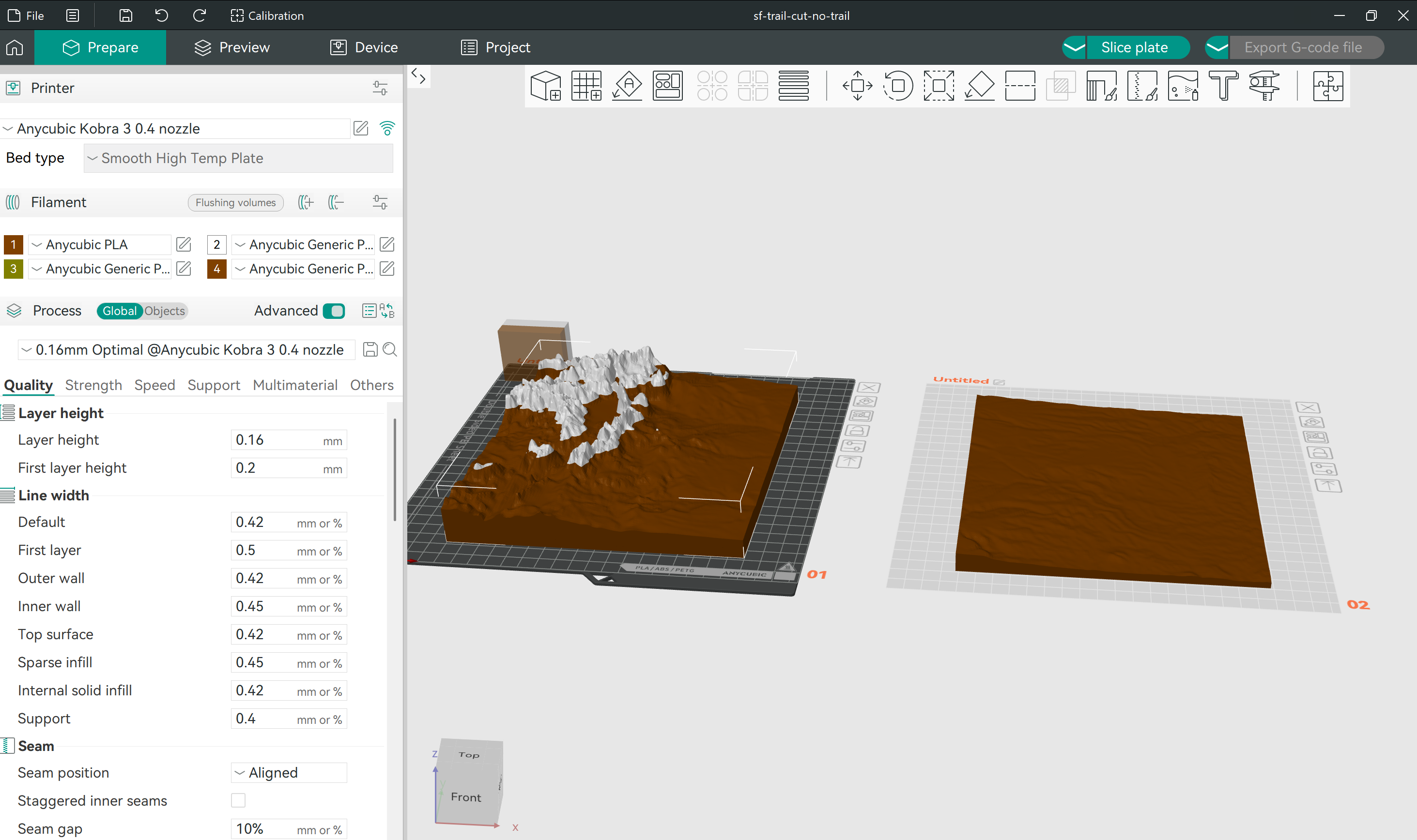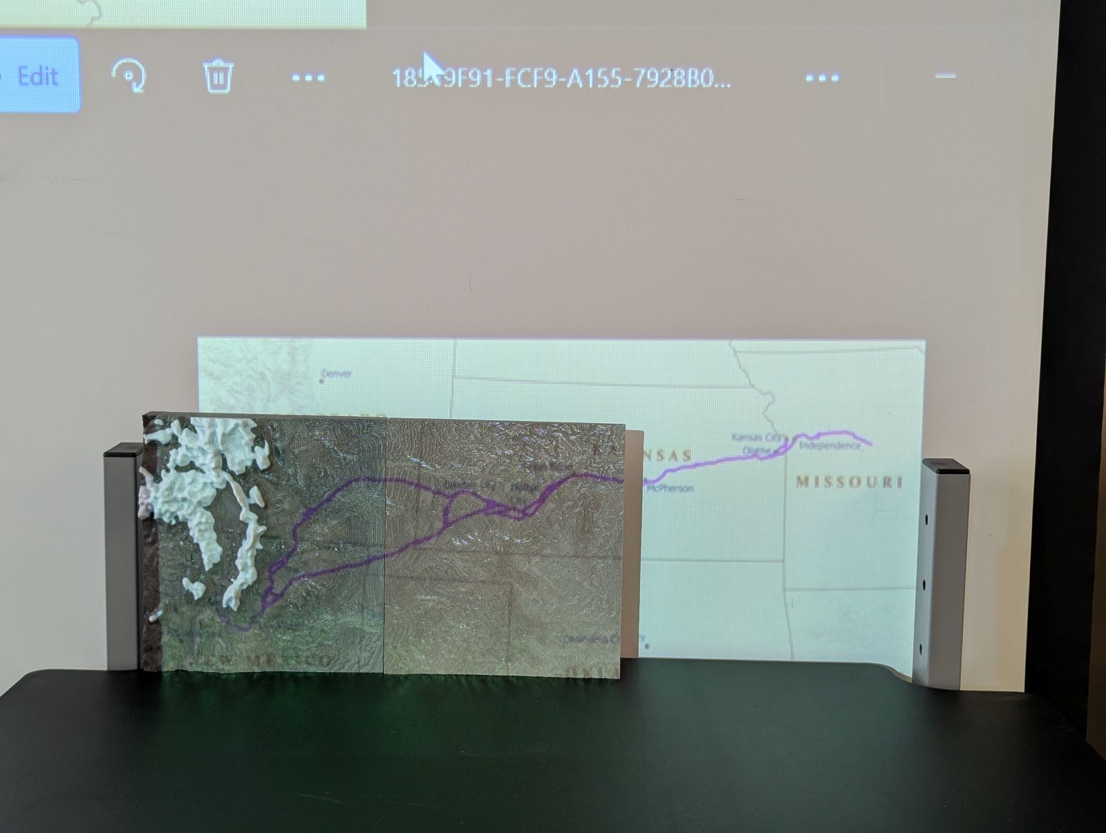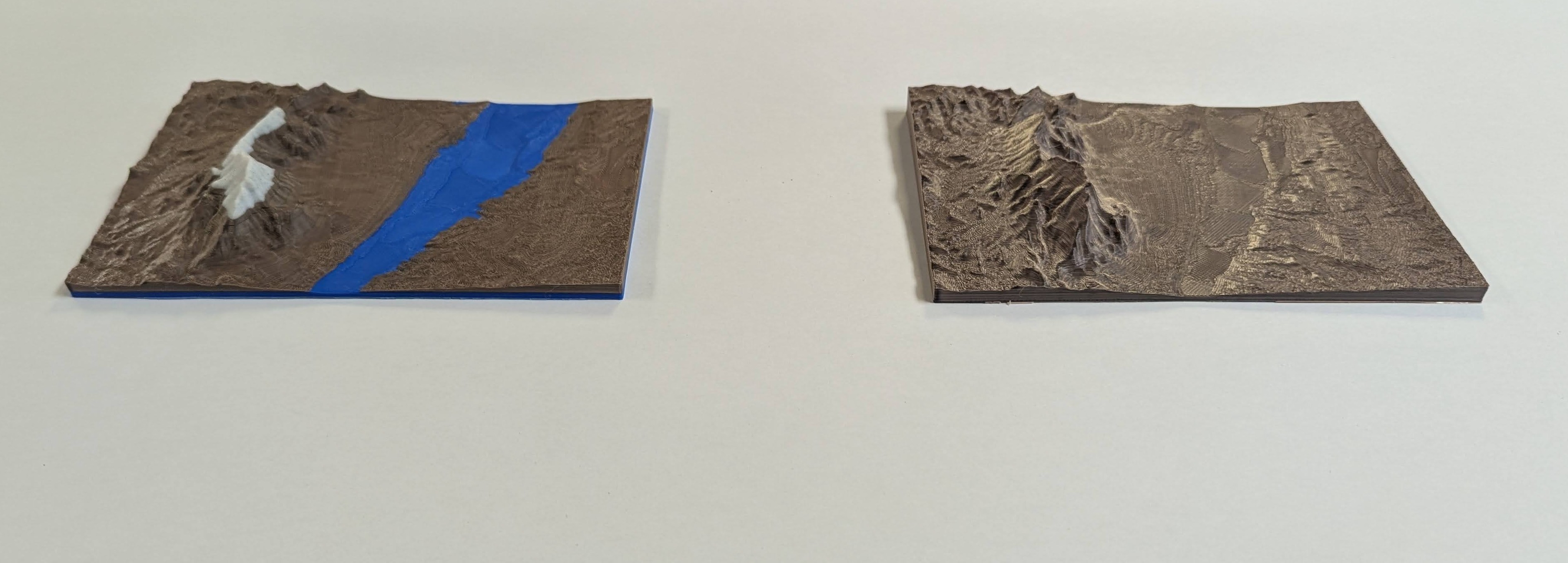 After printing out the first half and removing it from the build plate, the printer could proceed with printing the second plate. With both plates printed, we used a projection of the Santa Fe Trail to trace its path using acrylic paint pens. This allowed for greater detail and significantly reduced the duration of the 3D printing. If we were to do this 3D print over again, we would not choose a gradient filament because this created a color difference between the top layers of the two plates.
