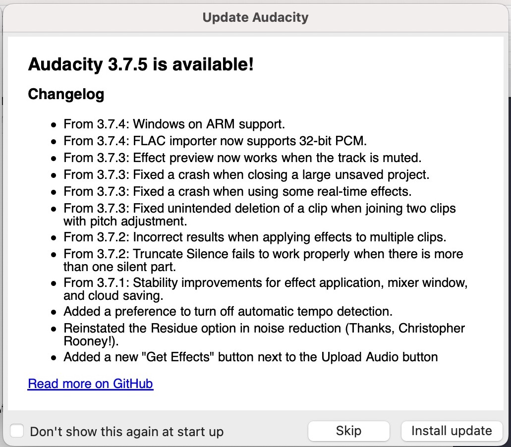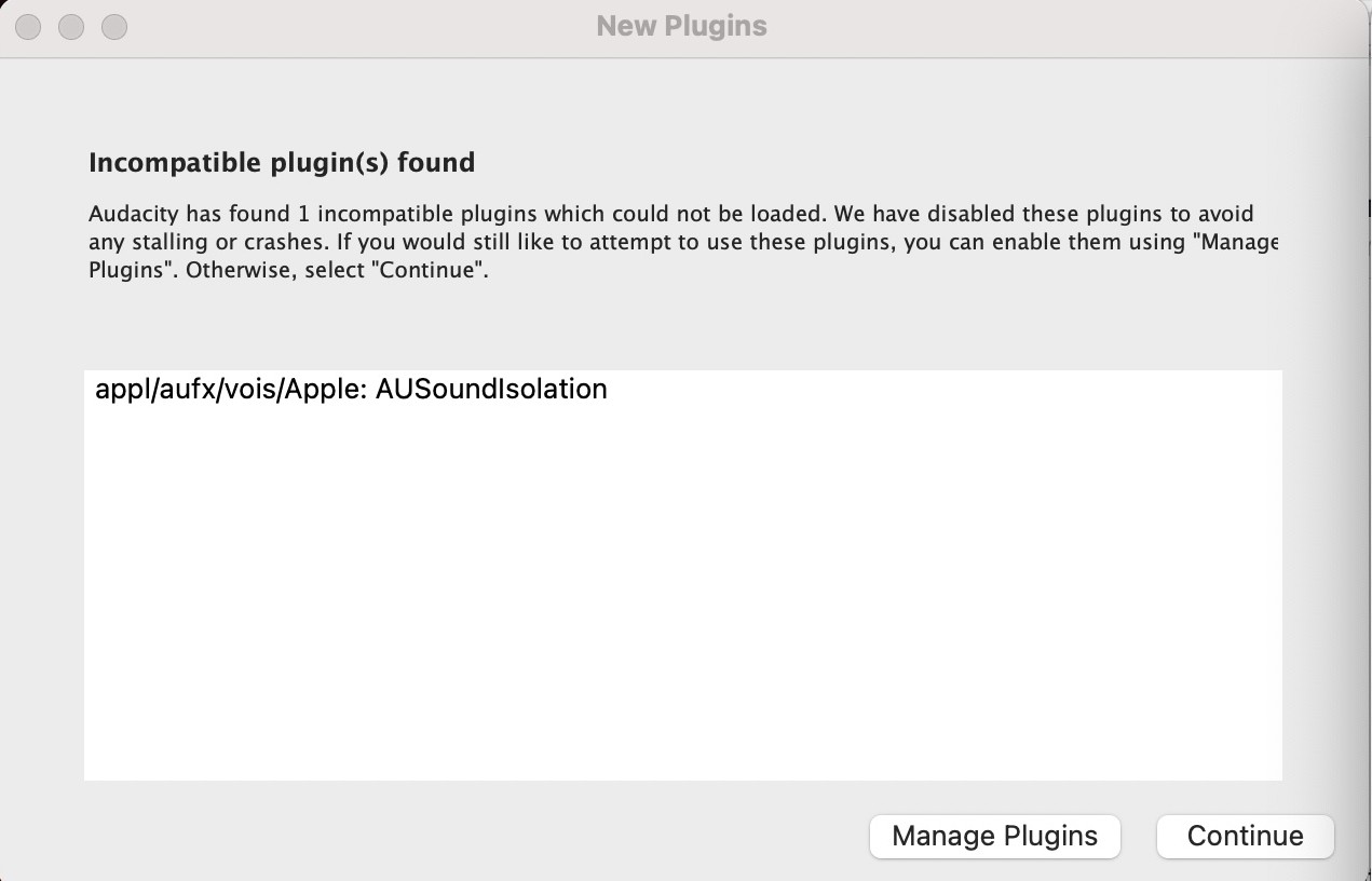 When using Audacity for the first time, a few dialog boxes will appear that you can click past. The screenshots below come from a first-time use of the Audacity app on one of the Mac workstations in the Amaranth Studio.