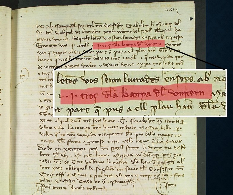 The idea for this paper came to me last summer as I read Josep Roca i Heras’s 1929 biography of Joan I of Aragon. Roca i Heras, in his discussion of Joan’s marriage to Matha Armagnac, explained that Matha’s first child, born in June 1374, died within a few months. This experience led her to a more aggressive pharmaceutical regimen during her second pregnancy, including the potion made from precious gems.1 I located the archival source, which you can see here, a payment record to Johan Davallano dated June 1, 1375.