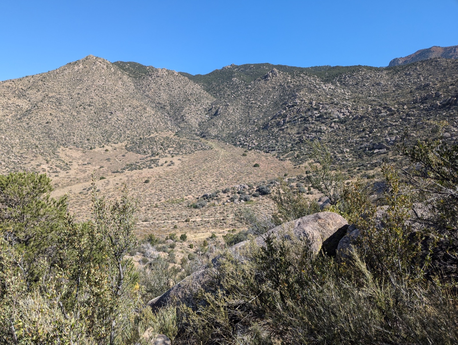 alt-text="Color photograph showing some hiking trails in a canyon of the Sandia foothills."